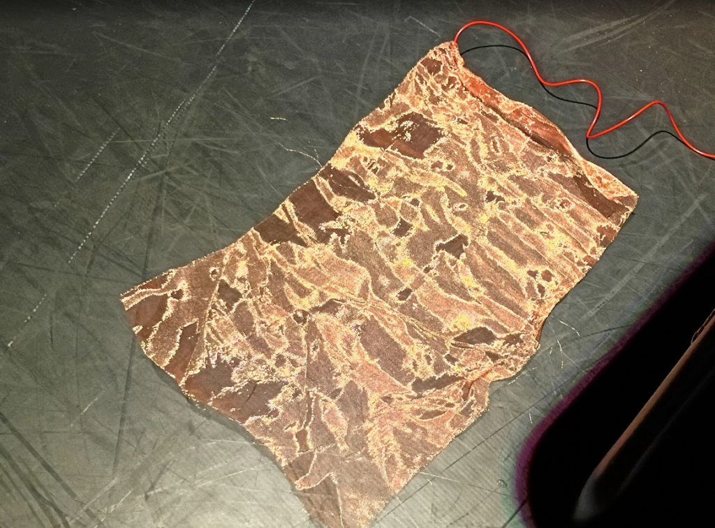 For this project I chose three technologies to explore, as shown above. First (left) is an ultrasonic sensor. It broadcasts an ultrasonic sound and listens for the returning echo. It is capable of detecting something within range as well as the distance the object is form the sensor. Second (center) is Infrared optical sensing. These are commonplace pieces of tech used to detect the presence of objects. A transmitter (clear LED) emits an IR beam of light. The receiver (black LED) detects the IR beam. If the path between the transmitter and detector is broken, the presence of an interfering object is detected. This is what usually prevents home garage doors form closing if something is in the way. Third (right) is a capacitive sensor. It detects the presence of an object by detecting a change in the state of charge across an electric circuit. See my PP3 for more information about how this works. For my tests I used a piece of copper mesh roughly 11×17 soldered to a length of wire (below). My cats were extremely interested in the mesh and kept triggering the sensor!