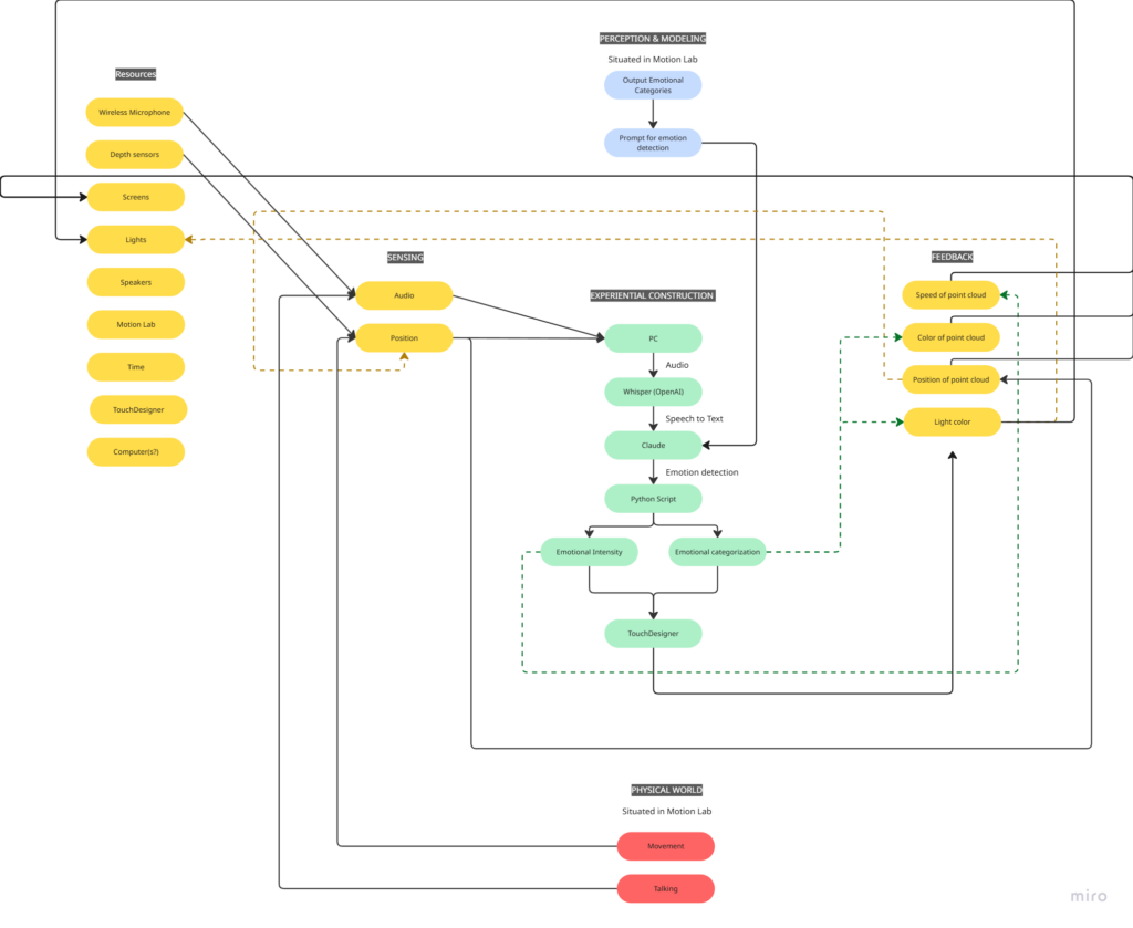 My idea for this cycle was simple (or atleast it seemed so in my head): make an AI-powered interactive experience where the user shares a space with an AI ‘presence’. It lives on a screen, but its there for you and it listens to whatever you have to say – or dont have to say. The score: a participant enters a space, speaks naturally, and the environment responds to the quality of what they shared through a particle system. No text output, no voice back. Just the space changing around them. The framing I gave participants was: “this is a friend you can talk to.” That framing is what became the main problem.