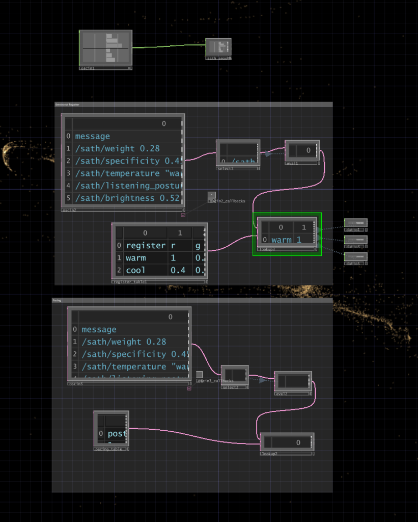 I wrote a python script that takes user input through the microphone, then uses OpenAI Whisper for speech-to-text transcription. It then sends the speech to claude in order to parse it according to the system prompt I gave it, which were metrics like emotional register, weight, intensity etc. The python script in turn sends these metrics to touchdesigner through OSC. Inside touchdesigner, I made table DATs that were storing the values of the incoming signals in order to apply those values to the visual system (a particle system). The values were suppsoed to effect the movement and color of the particle system.
