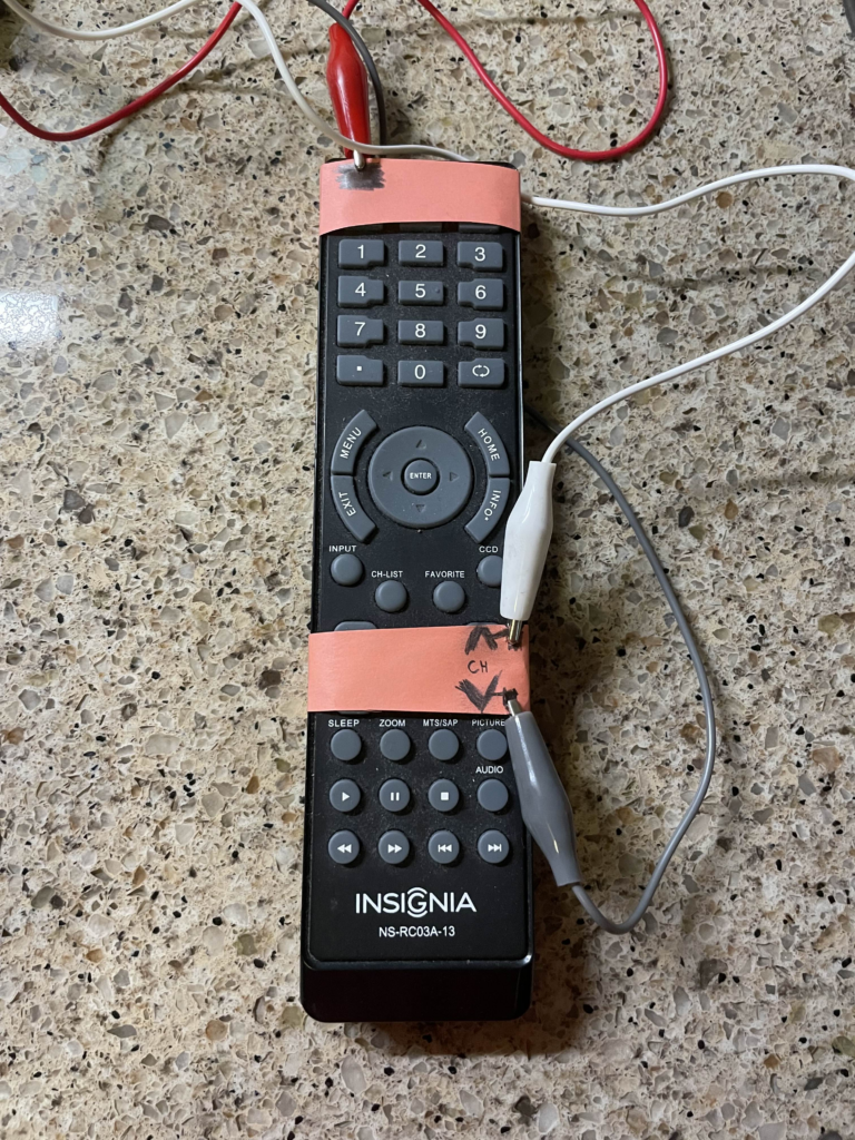 To me, the hardest part of using a Makey Makey is always finding a way to ground it all. But I had the perfect idea of how to do this on the remote: because people usually have to hold a remote in their hand when they use it, I can try to hide the ground connection on the back! See below.