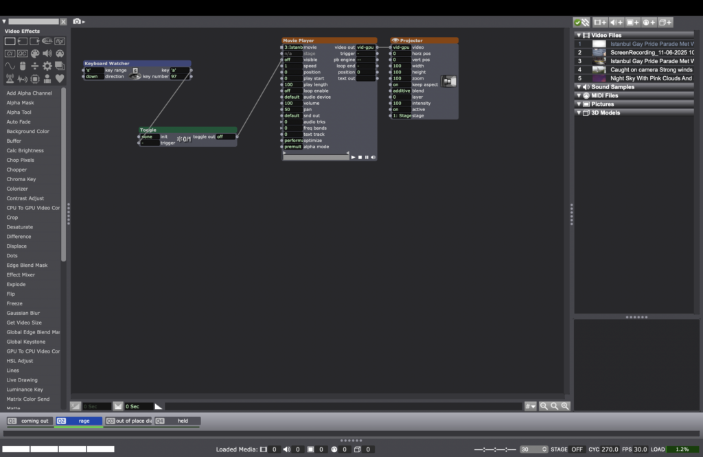 The book includes blank drawings for coloring, questions, phrases, journal prompts, and some information on queer history. While flipping through its pages, I remembered that I could use the conductive pencil of MakeyMakey to attach the cable to the paper and make it trigger something in Isadora. So I programmed a simple patch with videos that would get triggered in response to me touching the page in the area where I drew a shape with the conductive pencil and or any other conductive material.