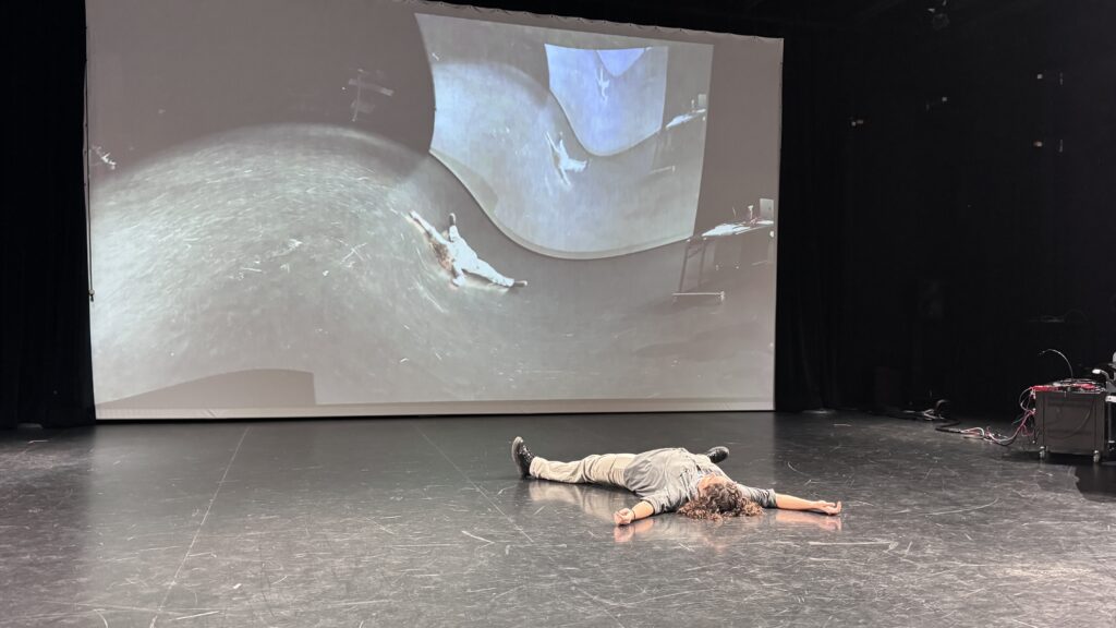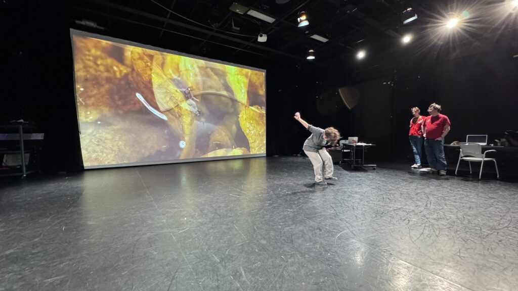 I edited the sound design, making the part of the song Honey by Kehlani that says “I like my girls just like I like my honey, sweet.” play 3 times so the lyrics wouldn’t be missed. In my cycle 2, the button that said “Dip me in honey and throw me to the lesbians” were missed by the experiencers. To make sure it catches attention, I colored it with yellow highlighter. To clarify and better explain the roles of the people holding the honey bottle and the book, I recorded a video of myself, trying to sound AI-like without the natural intonations in my regular speaking voice. I gave clear directions for two volunteers, named person 1 and person 2, inviting them into the space and telling them to do certain things in certain actions in my pre-recorded video. I also put two clean spoons in front of them, telling them that they could taste the honey if they wish. Both people tasted the honey and one of them started talking about personal connections with honey as the other joined. This conversation invited me to improvise within my score where is was structured enough due to having expected outcomes but fluid enough to be flexible along the way to accomplish the score. The choreography I composed didn’t happen the way I envisioned to happen and the experiencers didn’t end up completing the circuit to make the MakeyMakey trigger my Isadora patch. So I improvised and triggered the patch myself. This made the honey video appear on top of the swirly live video affected by the OSC in my pocket. I moved in changing angles and off-balances like I did in Cycle 2, with the recording of my noise effects also playing in the background.