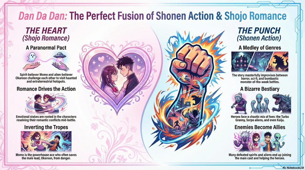 Posted: February 5, 2026 Filed under: Uncategorized Leave a comment »I chose the anime DanDaDan as my topic. I believe I am an expert in a lot of anime/manga related topics because I have been reading manga and watching anime for more than a decade now. I love DanDaDan especially because it’s one of the few series lately that’s a little different in a world of overly saturated genres like the leveling-up games. DanDaDan is a breath of fresh air and super weird and fun filled with all sorts of absurdity. So, in order to train notebook LM about this topic, I used some YouTube videos. The videos focused on the storyline, major arcs, characters, and why is it such a hit.