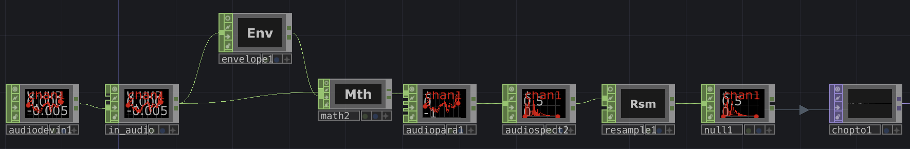 This portion of the network takes in audio from over the patch through the in_audio CHOP. The envelope, math, and audioparaeq objects slow the stream of data and boost high frequencies, respectively. This then is turned into a spectrogram and is sent directly to a chopto TOP.