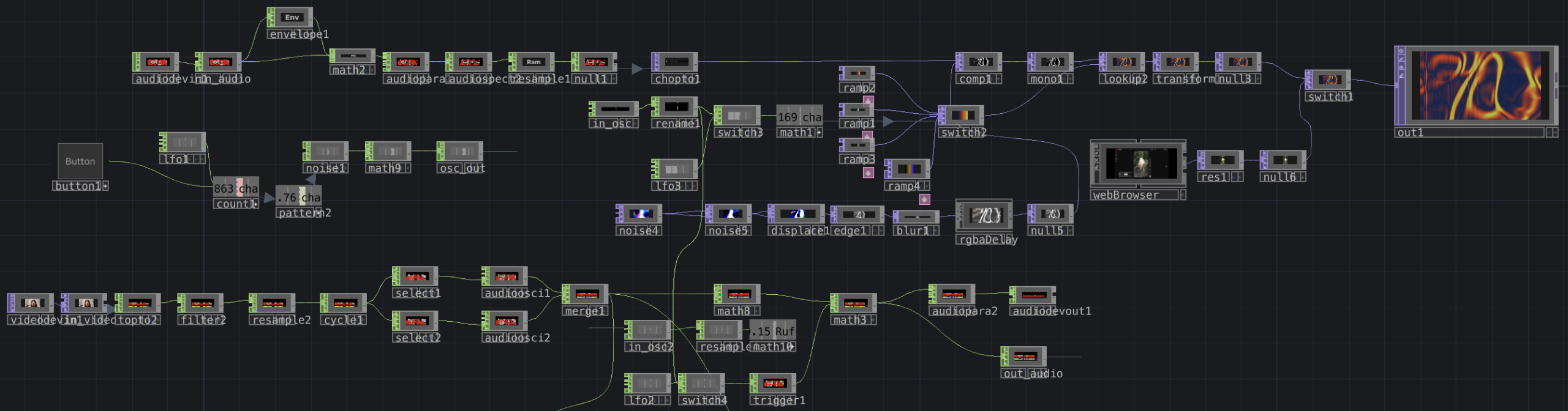 The Flipper is a TouchDesigner patch that uses an audio input to create video, and uses a video input to create audio. When used in a network this “cell-block” acts independently by creating entirely new audio and video, instead of just modifying the audio and video it receives. Its modularity lies in its ability to provide other users in the cell-block network with new sources of audio and video, that are themselves generated from other audio and video over the network.