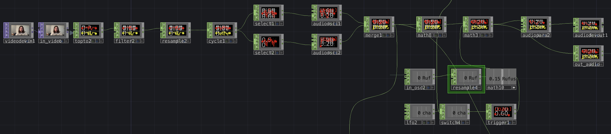 Lastly, this portion of the patch processes video received over the network from the in_video TOP (or in this case, a camera input) into audio. While I didn’t get quite as interesting an audio output as I wanted, I still think I was effective in transforming video to audio. The video that is received gets sent directly to a topto CHOP, which reads RGB values over the X and Y planes of the video. the following objects then reduce the amount of data, and turns those waves into a stereo audio signal by the merge CHOP. This wave is given an envelope by the math objects (I attempted to control this with another osc input but failed to make it work) and is sent out over the network. An example of audio is included below.